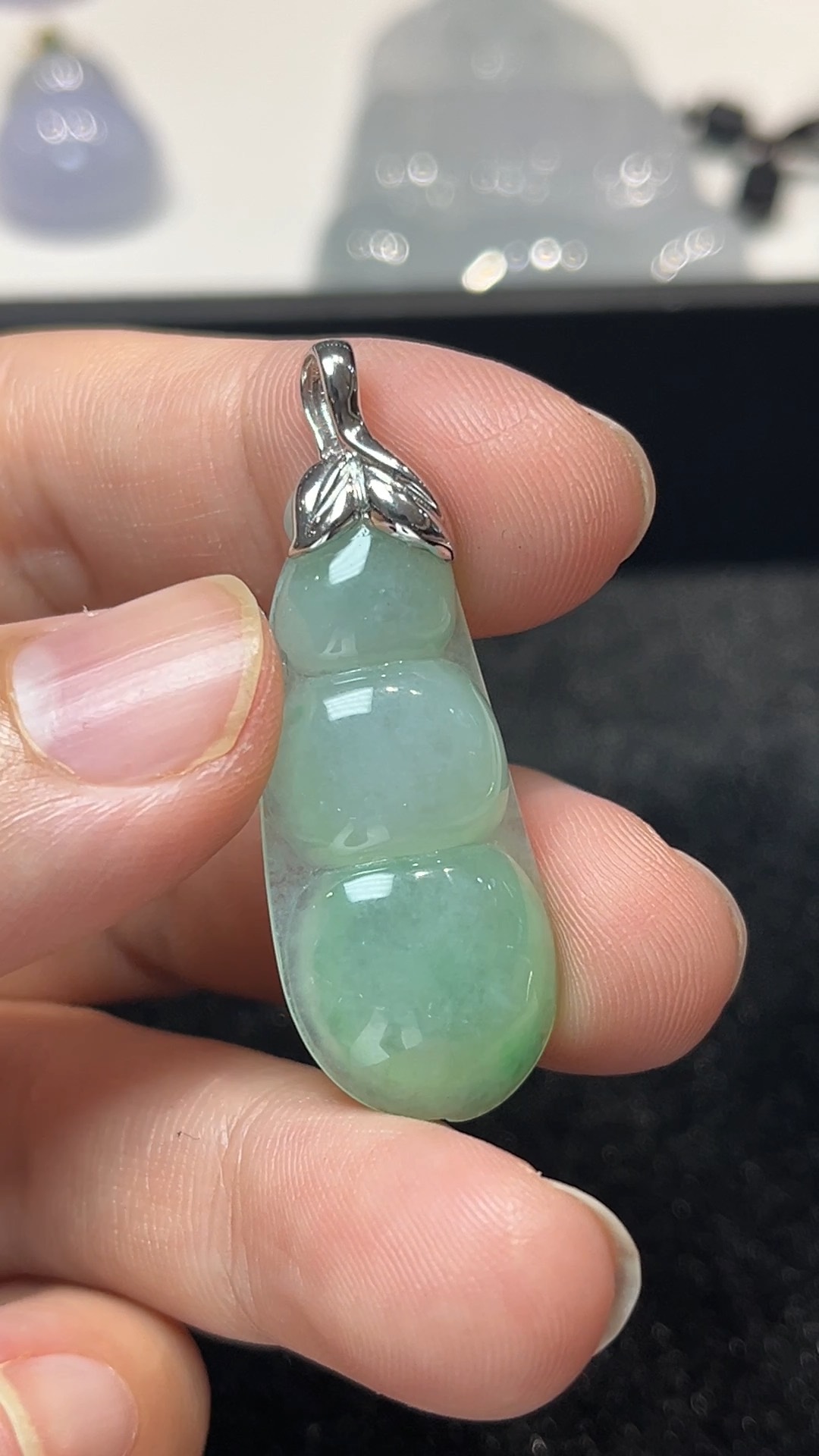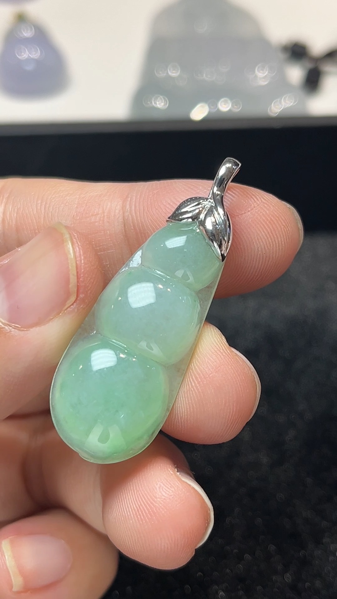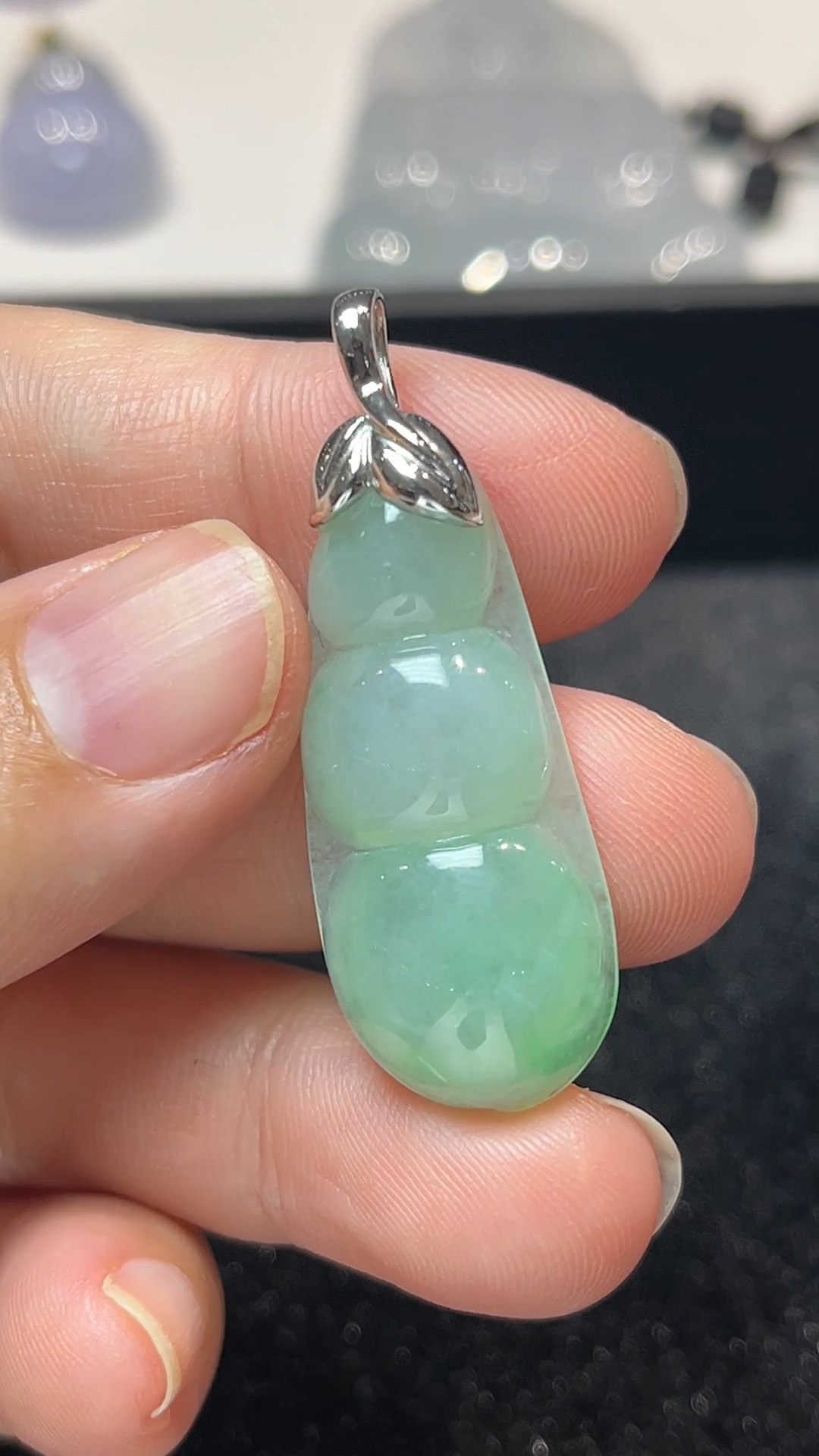 這款天然A級翡翠福豆吊墜(編號#275),採用質地溫潤通透的淺綠翡翠雕琢而成,外型為傳統「福豆」造型,線條飽滿圓潤,寓意多福多壽、子孫綿延。吊墜頂部搭配18K白金鑲嵌莖部設計,如嫩芽破土,點出生命力與新生之意,同時提升整體工藝質感與佩戴穩定性。融合東方寓意與現代簡約感,是一件兼具文化與時尚氣息的雅緻吊墜。