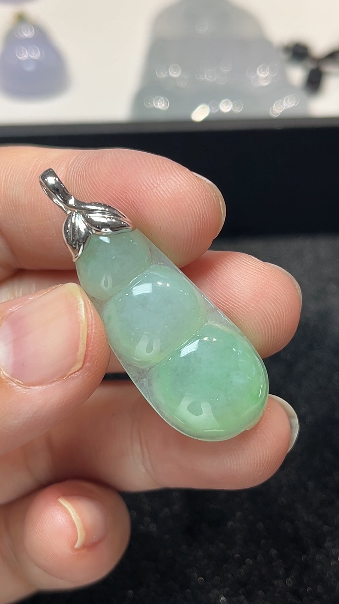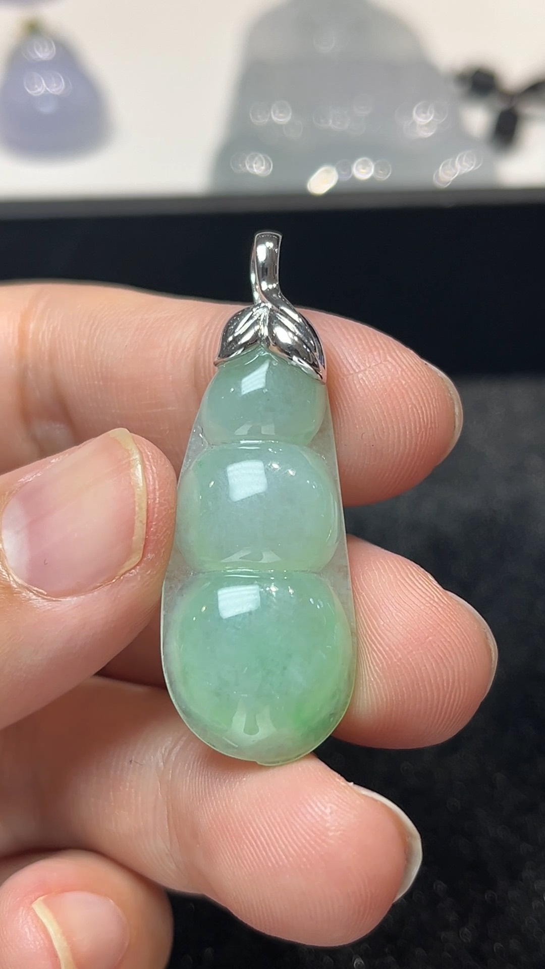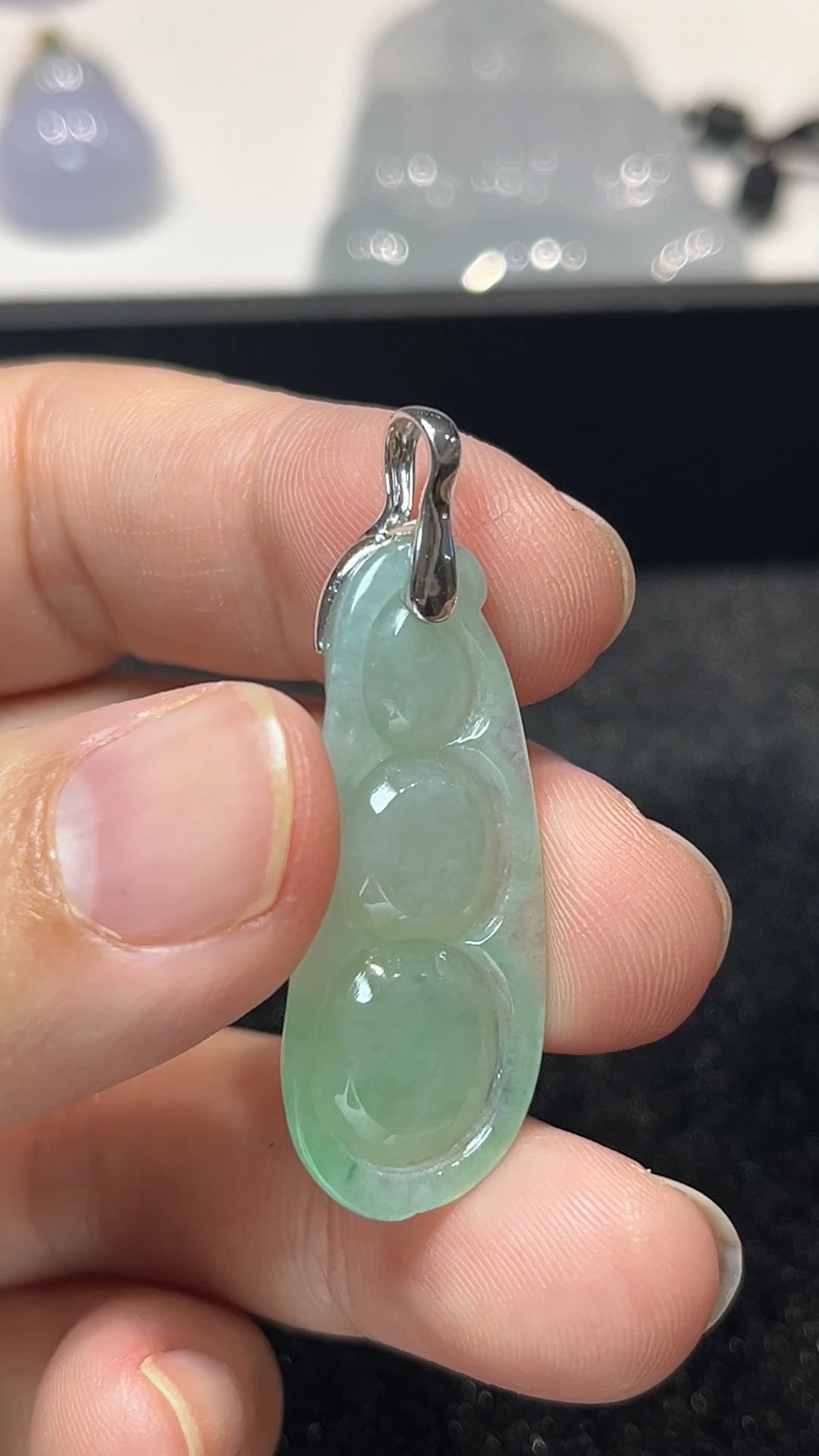 這款天然A級翡翠福豆吊墜(編號#275),採用質地溫潤通透的淺綠翡翠雕琢而成,外型為傳統「福豆」造型,線條飽滿圓潤,寓意多福多壽、子孫綿延。吊墜頂部搭配18K白金鑲嵌莖部設計,如嫩芽破土,點出生命力與新生之意,同時提升整體工藝質感與佩戴穩定性。融合東方寓意與現代簡約感,是一件兼具文化與時尚氣息的雅緻吊墜。