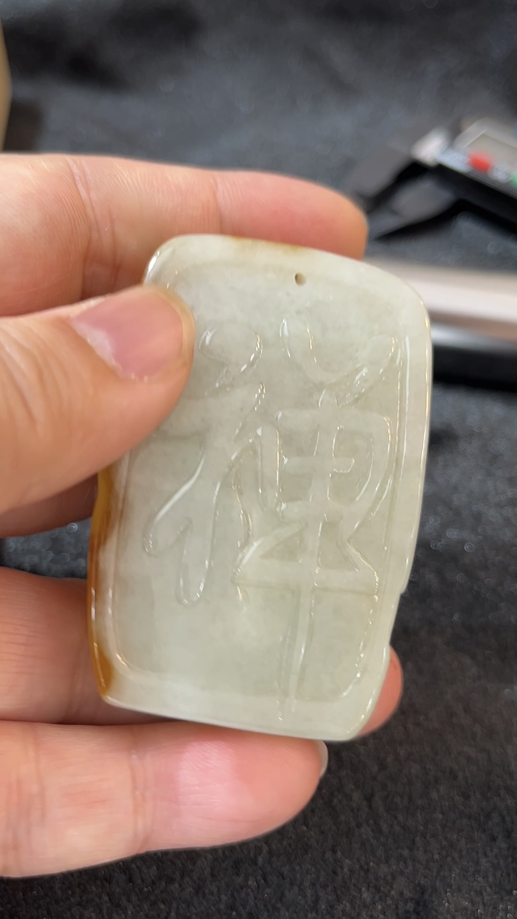 此款翡翠吊墜主角為逍遙佛公——笑口常開、肚大能容,象徵歡喜自在、諸事順遂。中間雕刻一個特大「佛」字,象徵心存佛法,萬事無憂。整體構圖融入雲紋與漸層色彩,使佛公形象更加圓潤生動,極具靈性與文化底蘊。