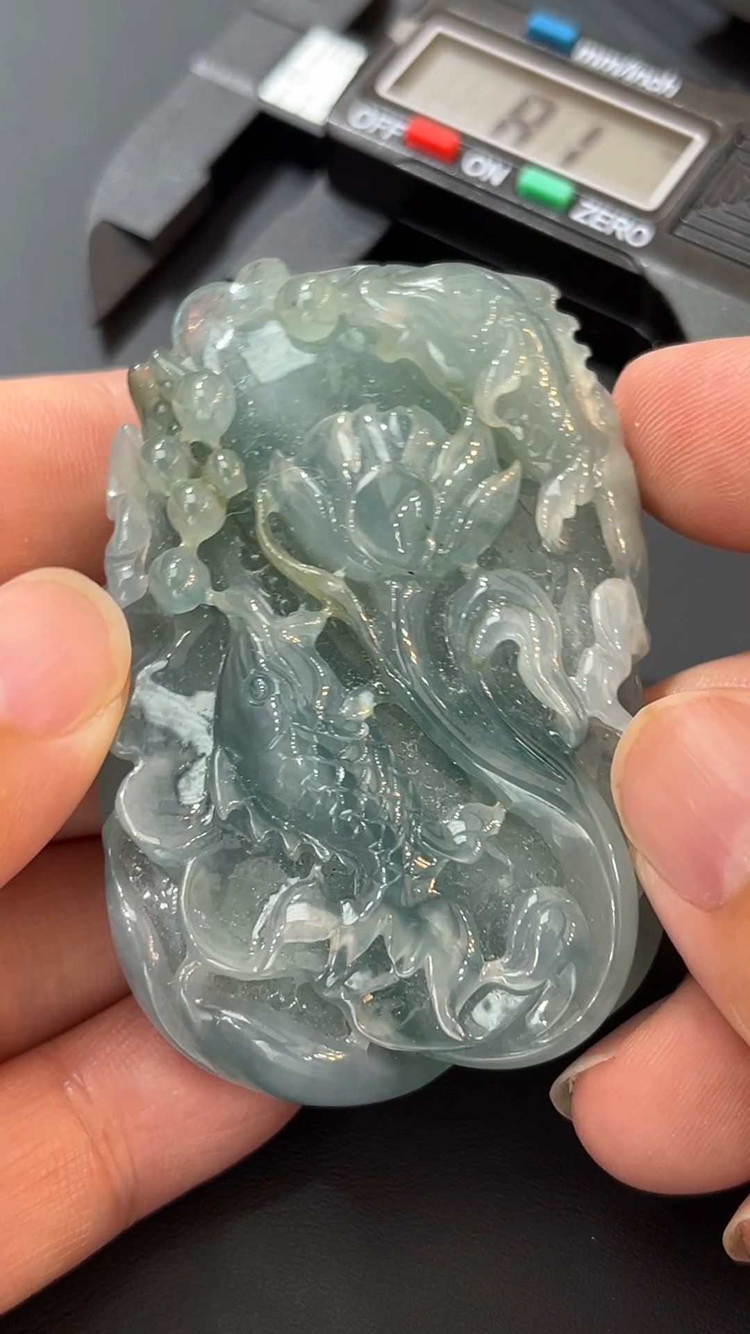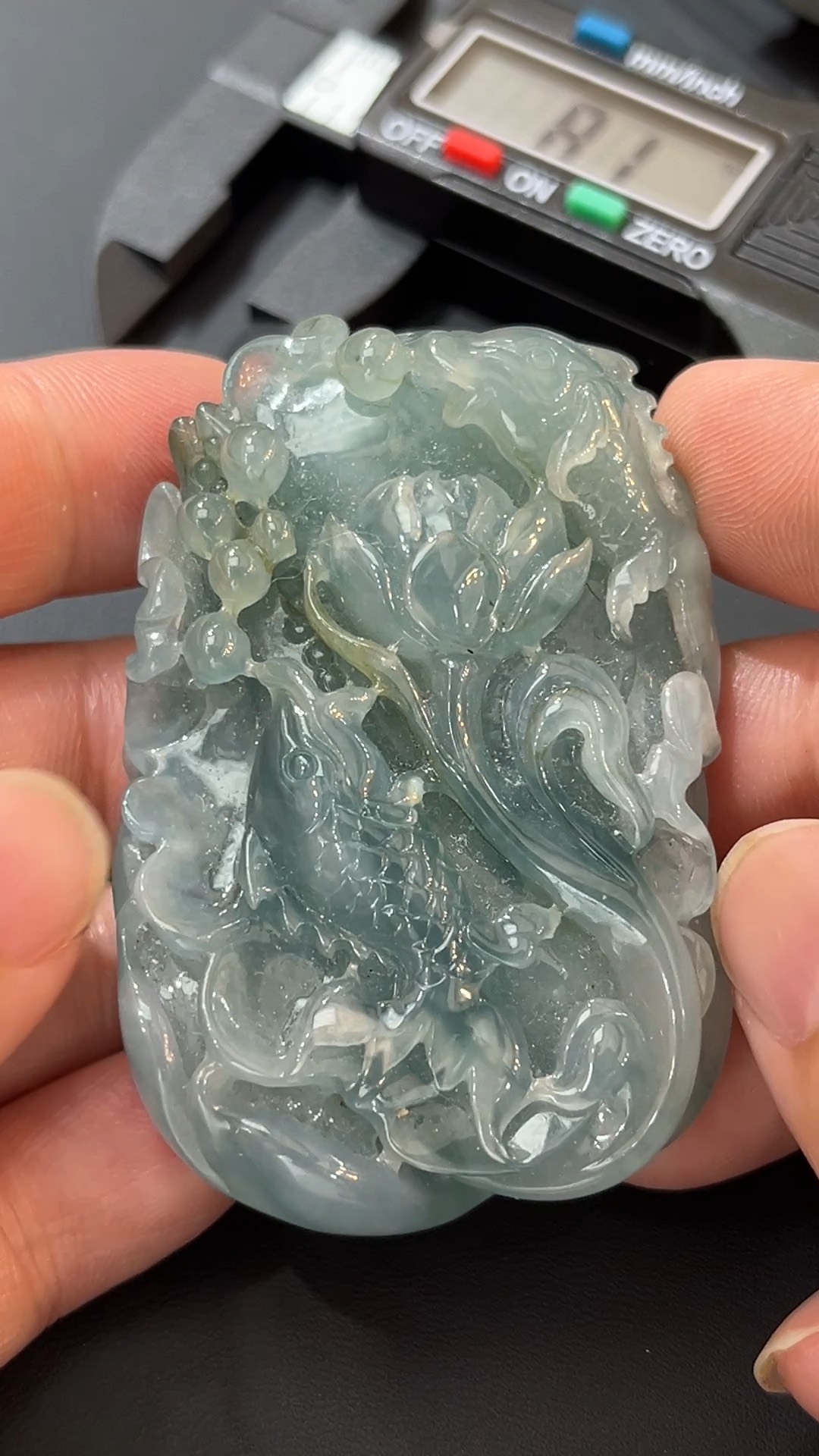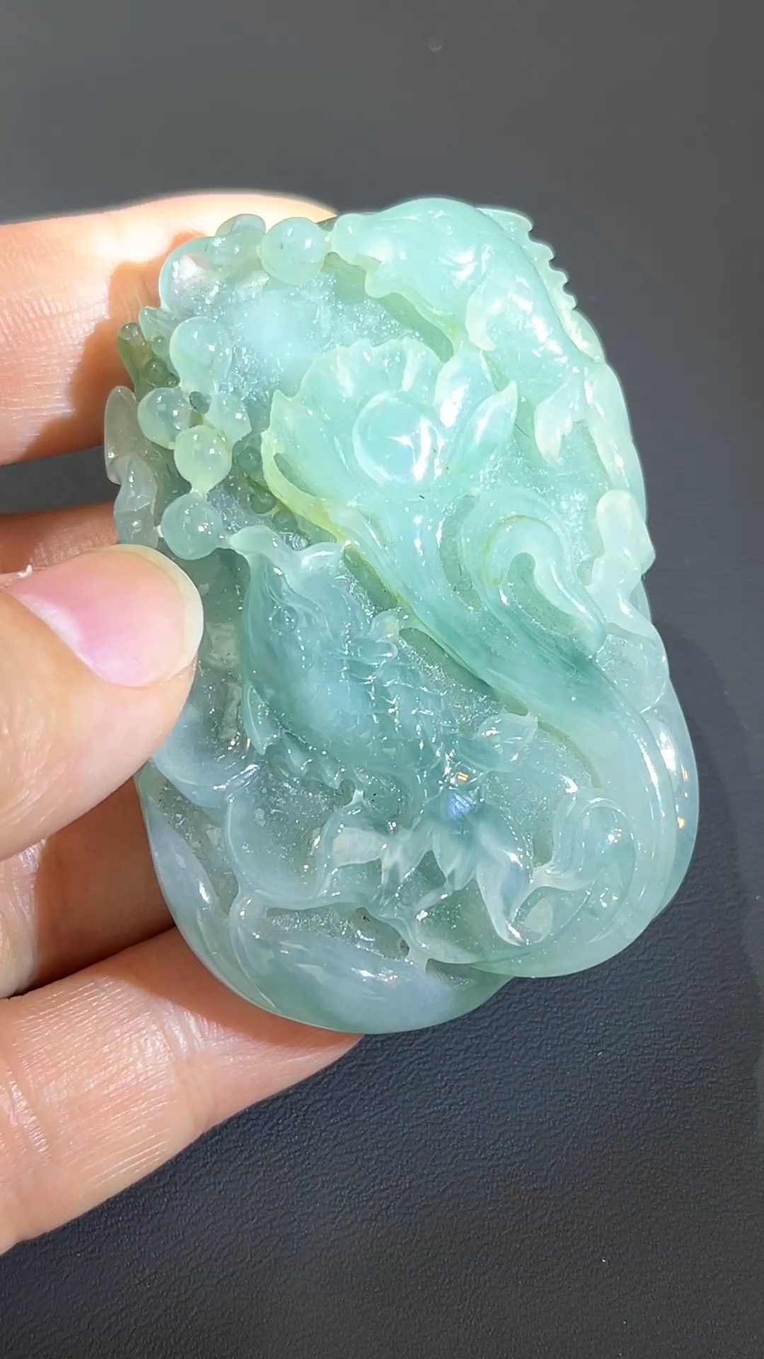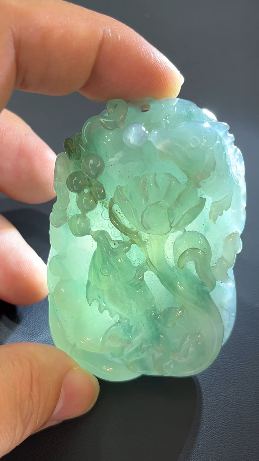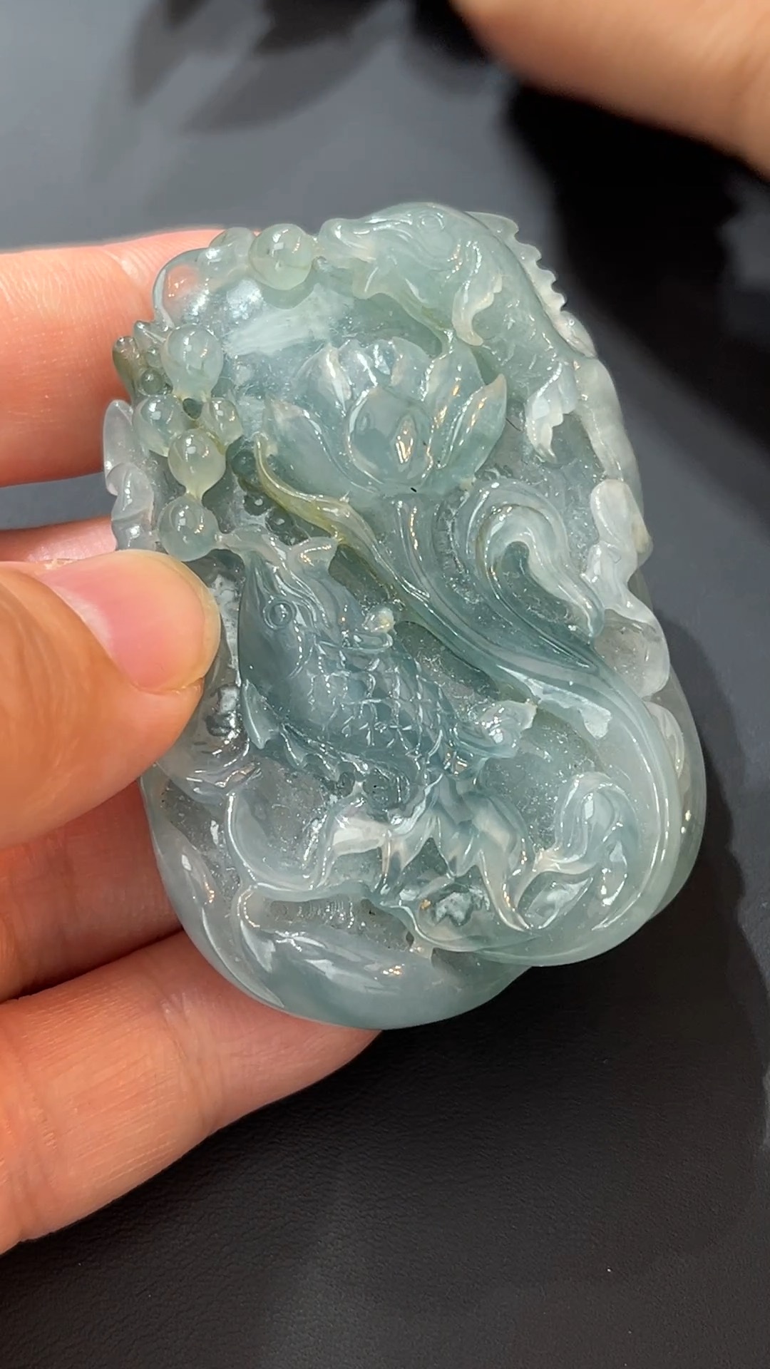 貨品編號#380 魚牌介紹: 此款翡翠魚牌採用深藍色調,蘊含深海般沉穩氣息。以種老翡翠為材,質地細膩溫潤,色澤自然飽滿,經雕刻師傅以立體雕刻技法精琢而成,紋理分明,層次豐富。整體造型厚身大件,手感紮實,氣勢非凡。既具美學價值,又承載吉祥寓意,是陳設與收藏兼備的翡翠工藝臻品。