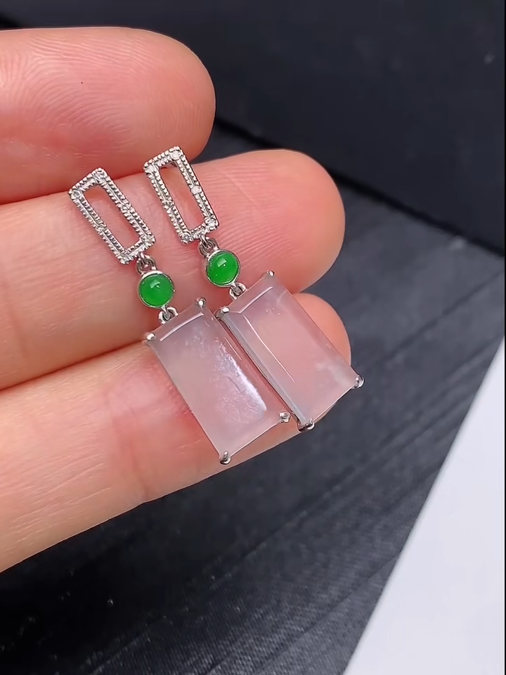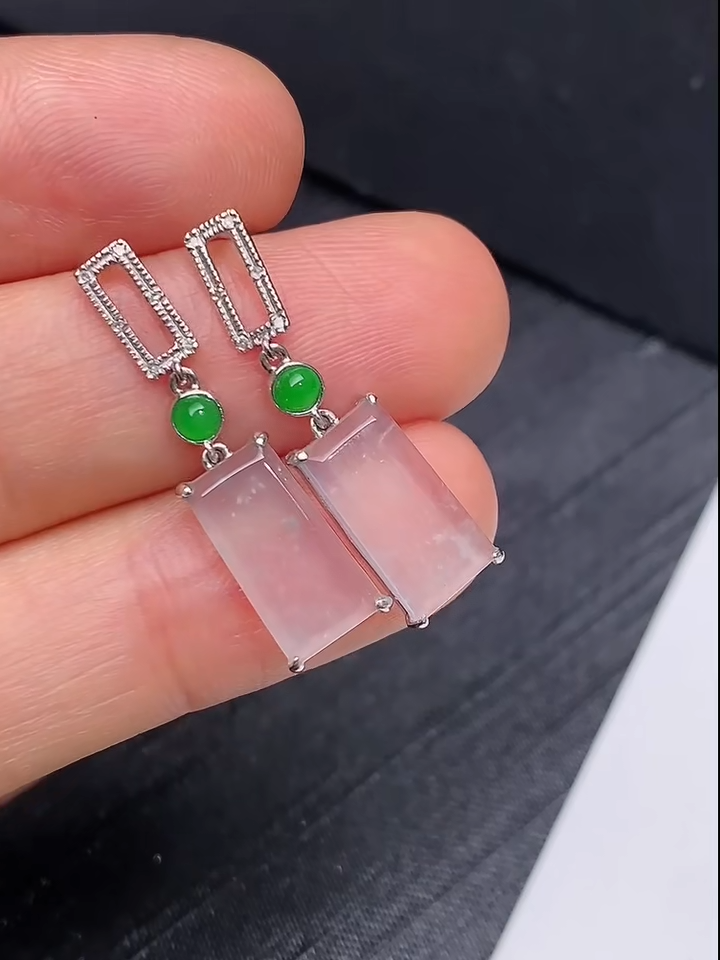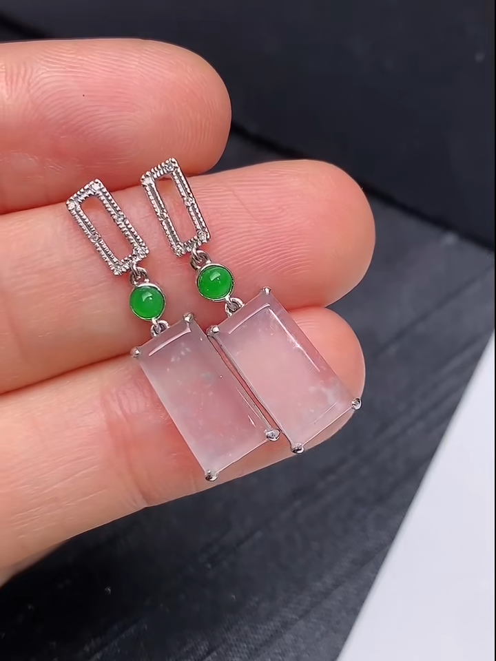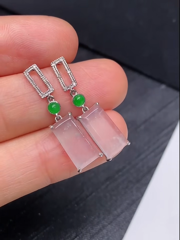 這款貨品編號 843 的翡翠耳環,採用 18K金鑲嵌工藝,搭配白冰翡翠「無事牌」設計,象徵平安吉祥。耳環以簡約矩形白冰翡翠為主石,配合翠綠珠粒點綴,展現出清新典雅的氣質。