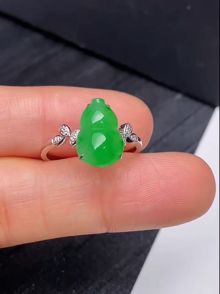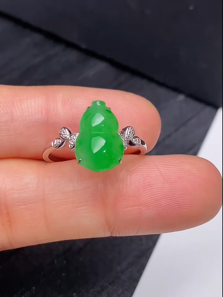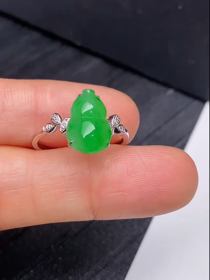 貨品編號 847 的翡翠戒指,以天然陽綠翡翠雕刻成葫蘆造型,寓意「福祿雙全、吉祥如意」。戒指採用 18K金鑲嵌工藝,穩固耐用,襯托翡翠的晶瑩質感。設計典雅大方,既能日常佩戴,也適合作為珍藏珠寶。