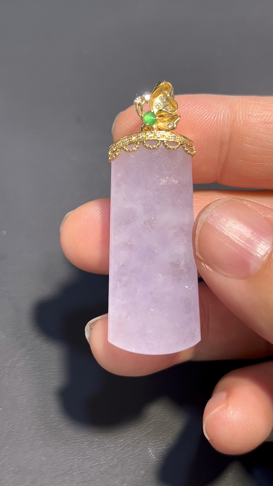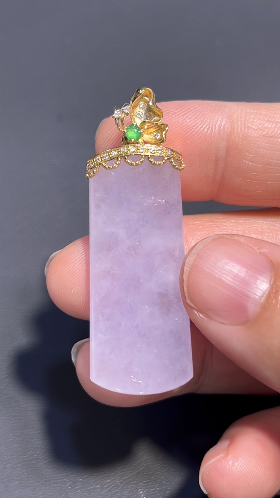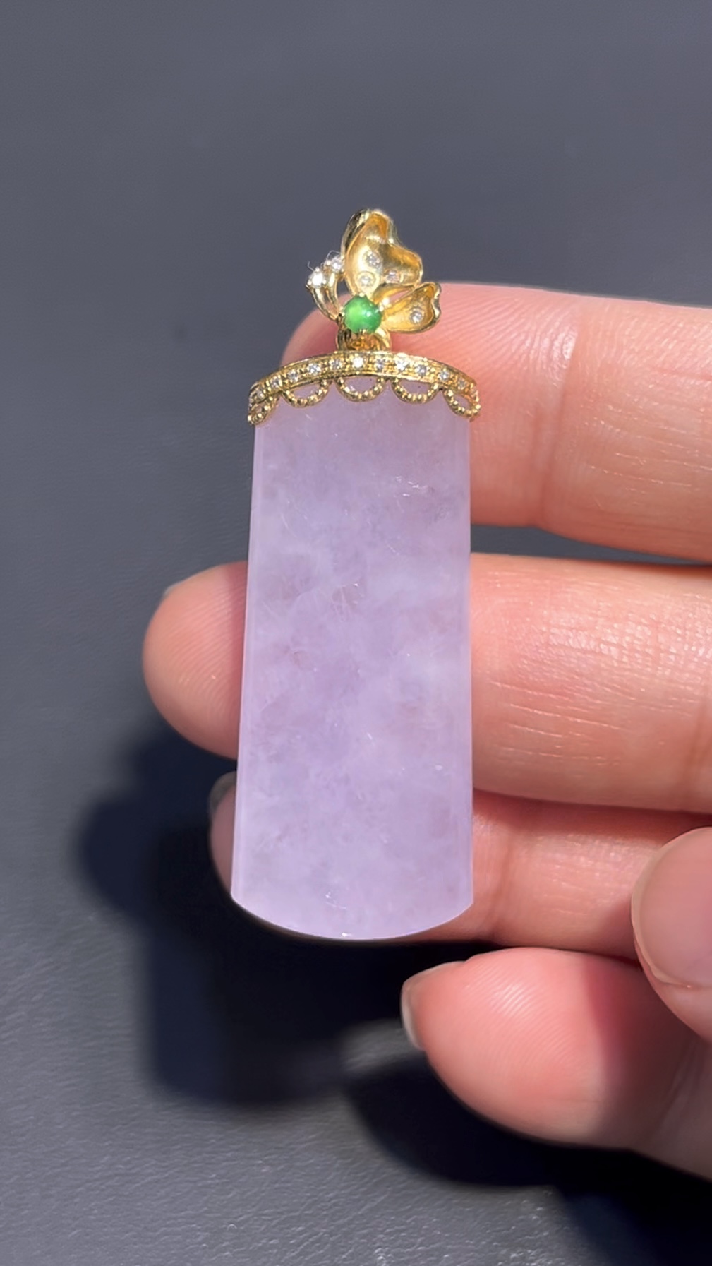 編號#677 翡翠紫羅蘭無事牌,選用種水特別好的天然翡翠玉料打造,玉質細膩通透,水頭充足,色澤呈柔和紫羅蘭色,氣質高雅,溫潤如霧。無事牌造型簡約大方,寓意平安無事、心境寧靜。吊墜搭配18K黃金蝴蝶扣,造型精緻靈動,象徵蛻變與重生,為整體作品增添一抹優雅與深意。此件作品融合翡翠的靈性美感與設計巧思,是一件兼具文化寓意與時尚品味的翡翠精品。