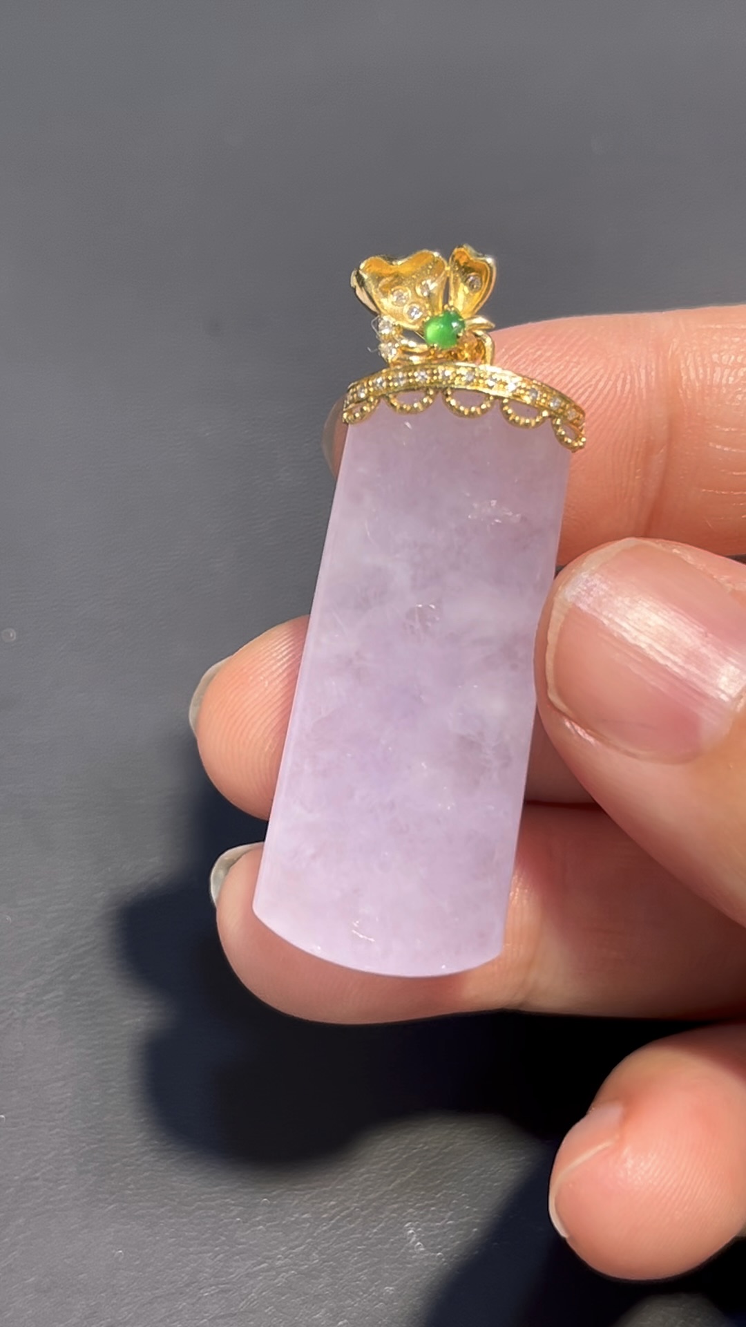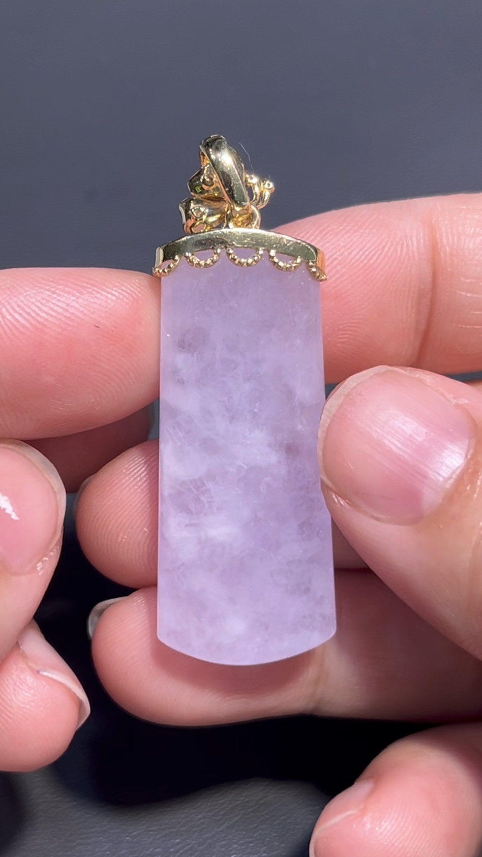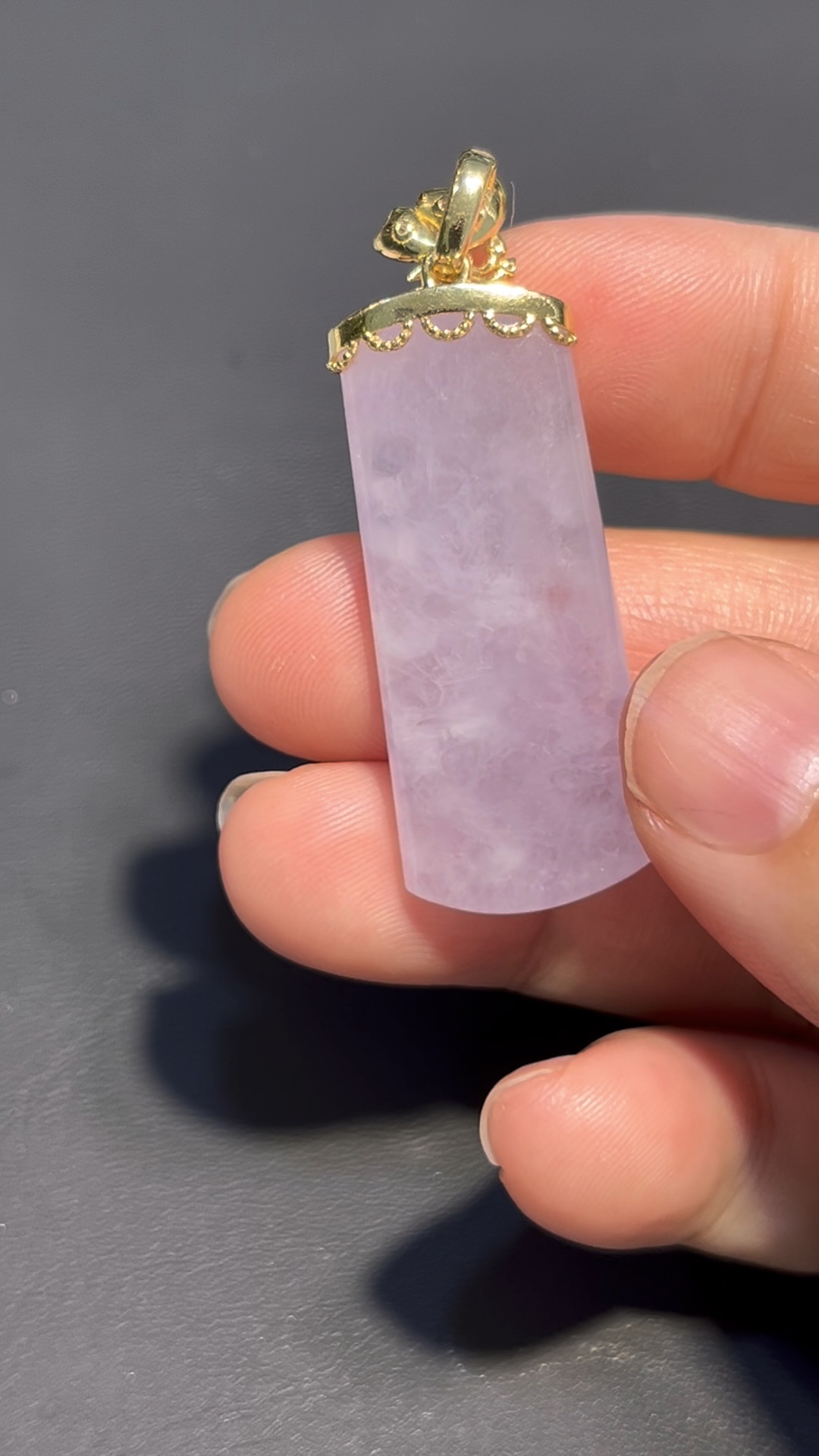 編號#677 翡翠紫羅蘭無事牌,選用種水特別好的天然翡翠玉料打造,玉質細膩通透,水頭充足,色澤呈柔和紫羅蘭色,氣質高雅,溫潤如霧。無事牌造型簡約大方,寓意平安無事、心境寧靜。吊墜搭配18K黃金蝴蝶扣,造型精緻靈動,象徵蛻變與重生,為整體作品增添一抹優雅與深意。此件作品融合翡翠的靈性美感與設計巧思,是一件兼具文化寓意與時尚品味的翡翠精品。