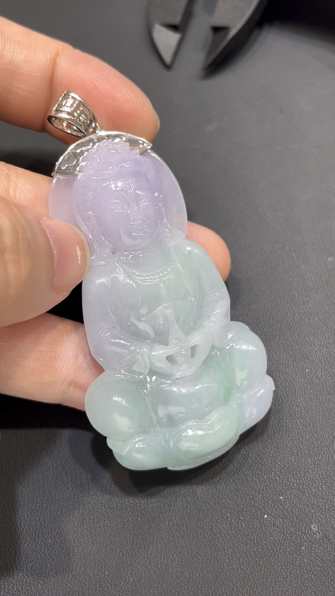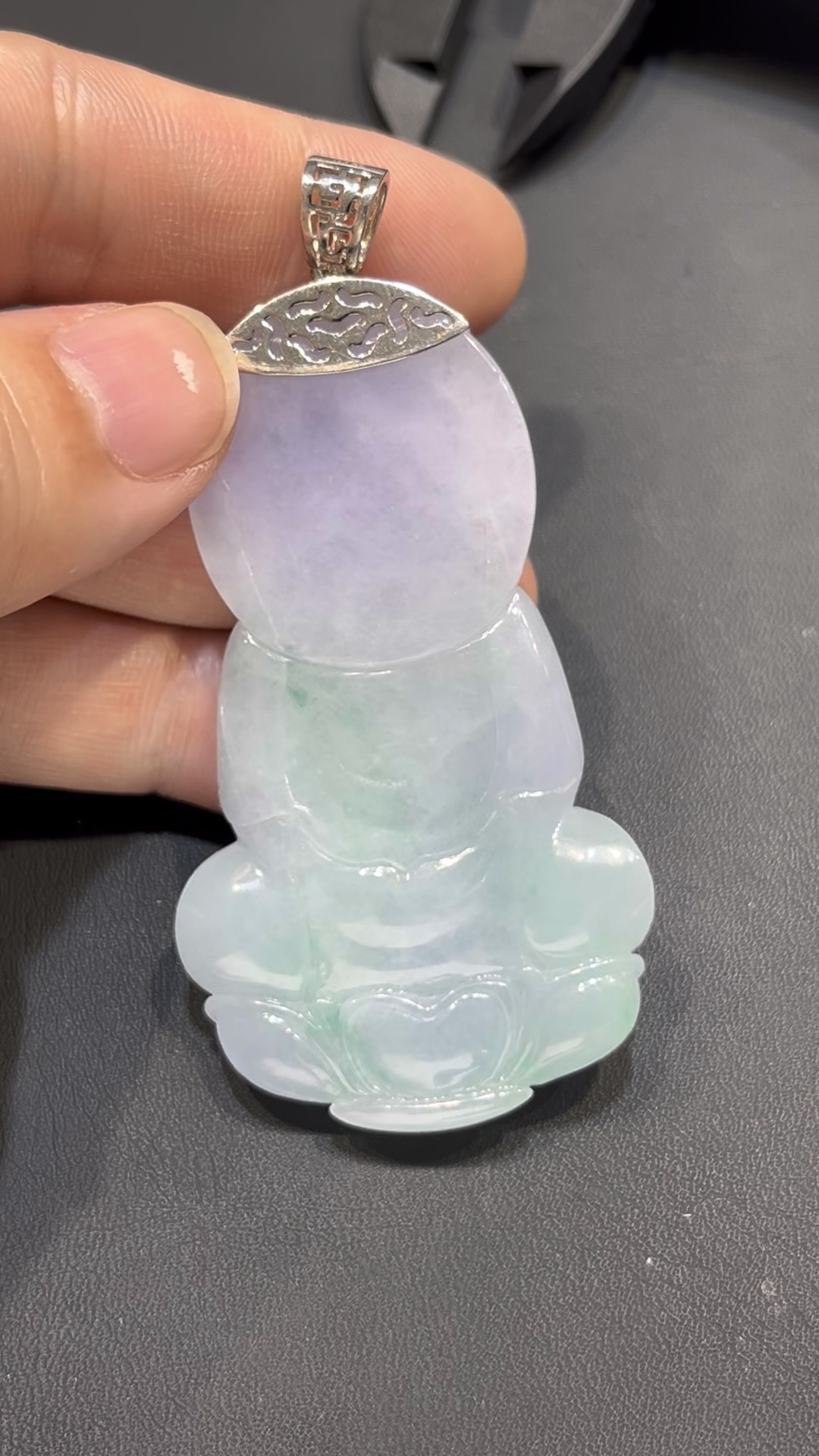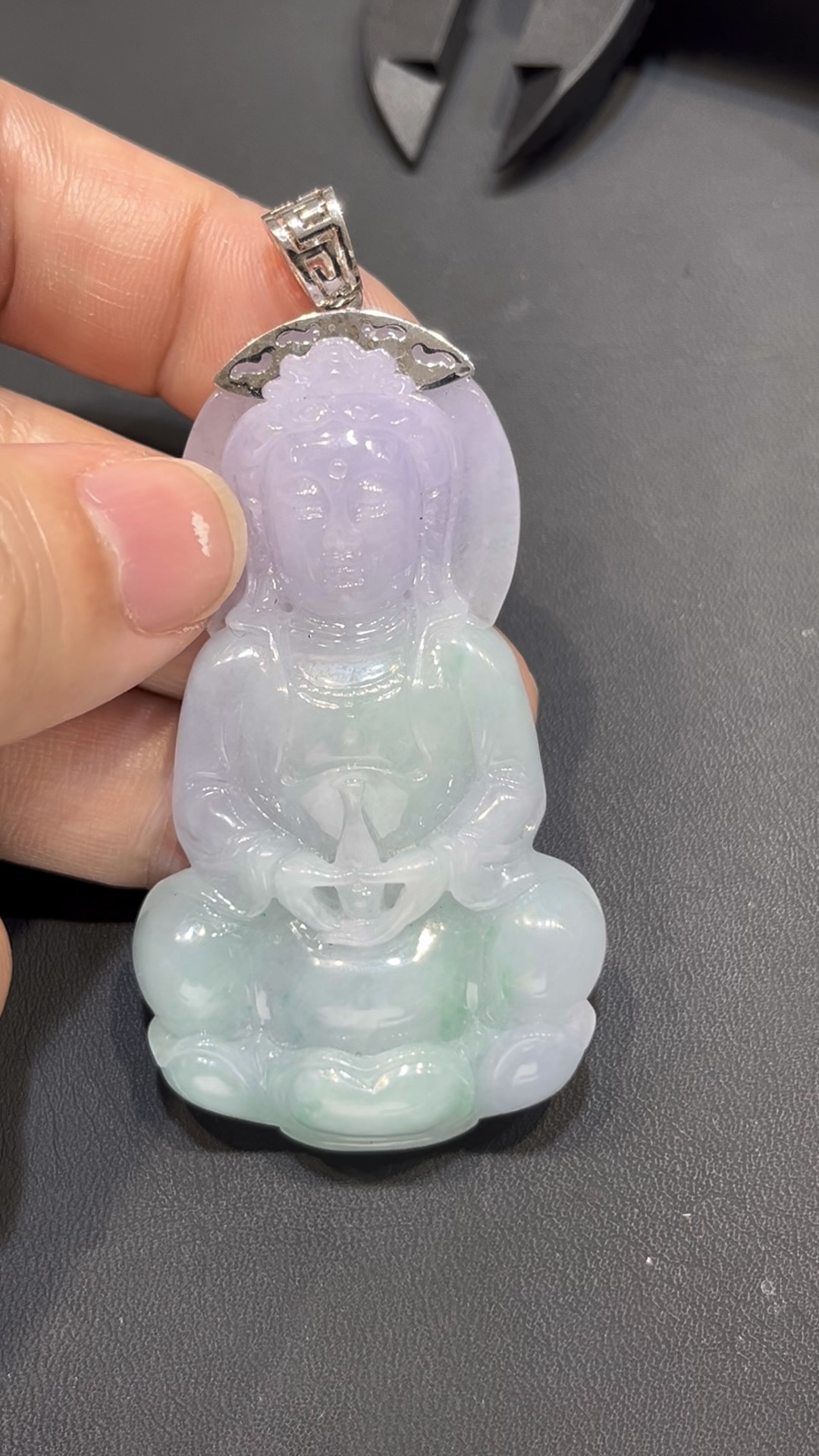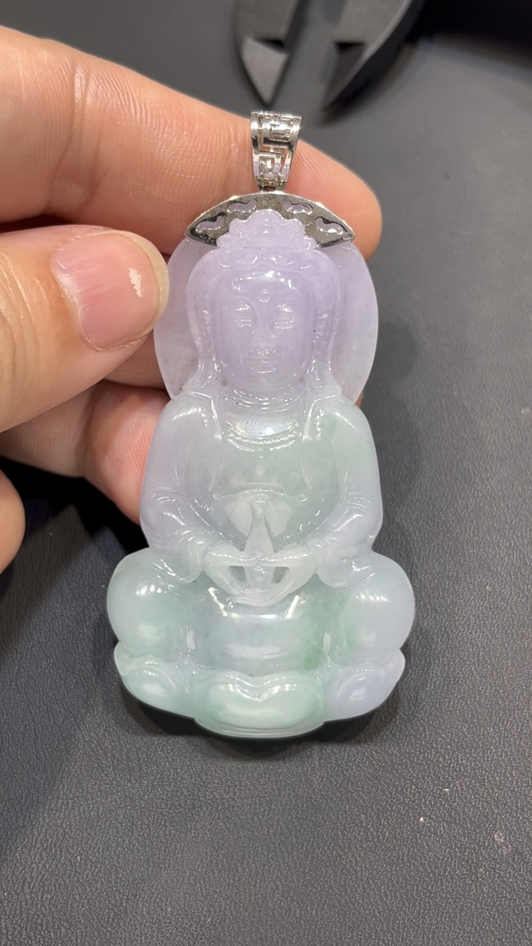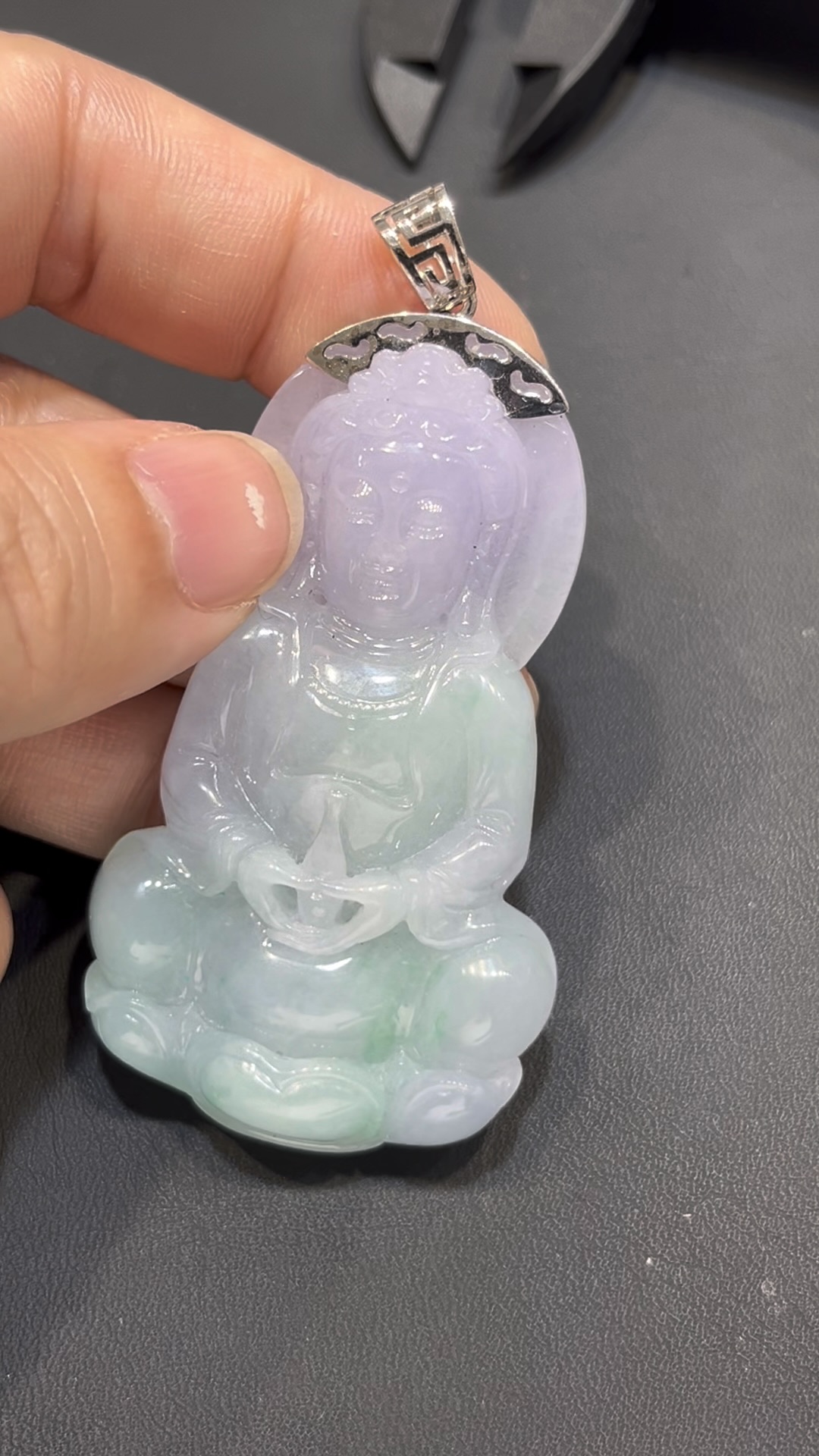 翡翠觀音吊墜,編號#798,選用天然春彩色翡翠玉料,色澤融合淡紫、粉綠與柔白,呈現出如春日晨光般的溫潤色調,質地細膩潤澤,通透度佳。春彩翡翠因其色彩柔和、氣質清雅而深受藏家喜愛,象徵祥和、靈性與福慧圓滿。
