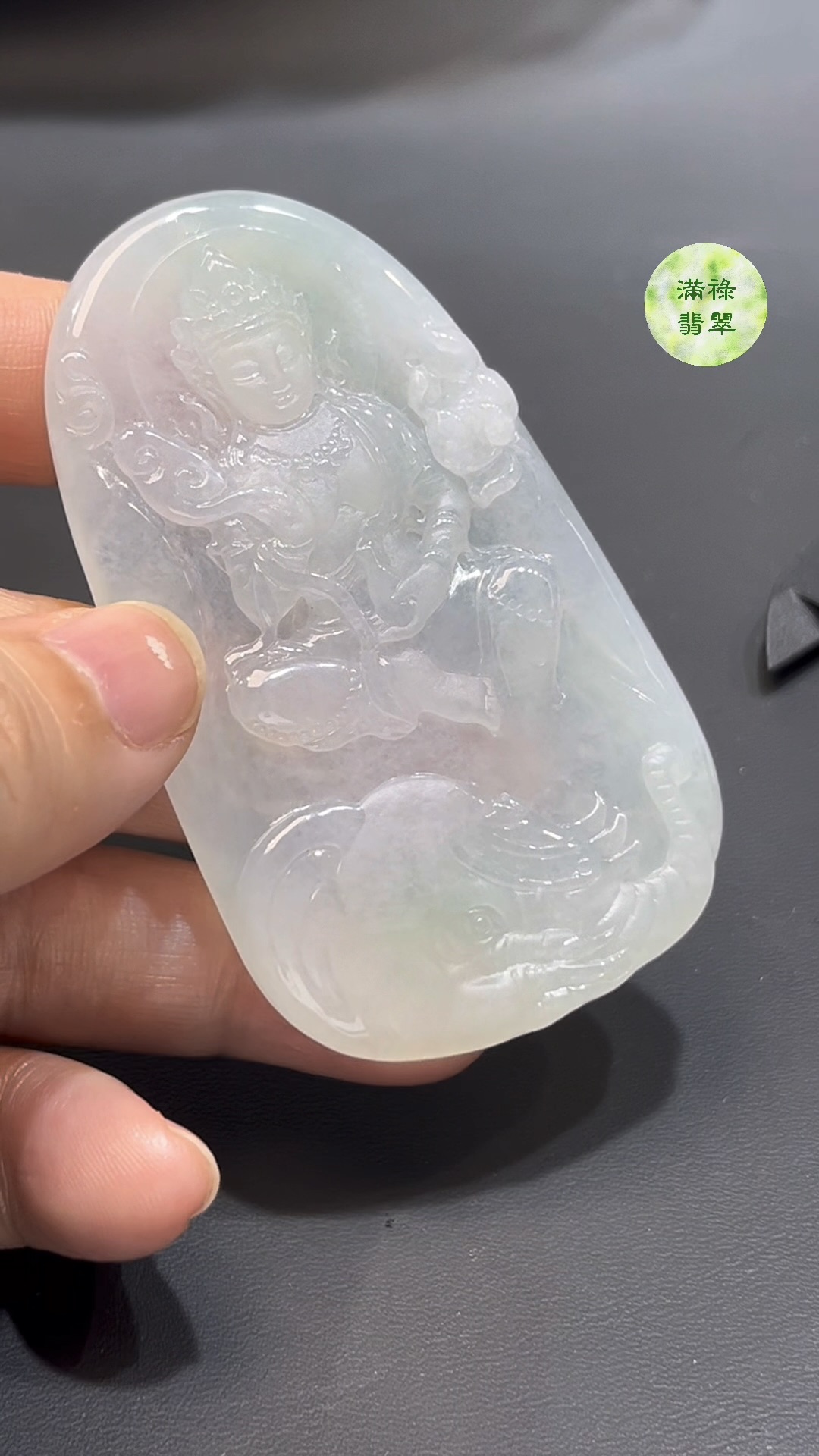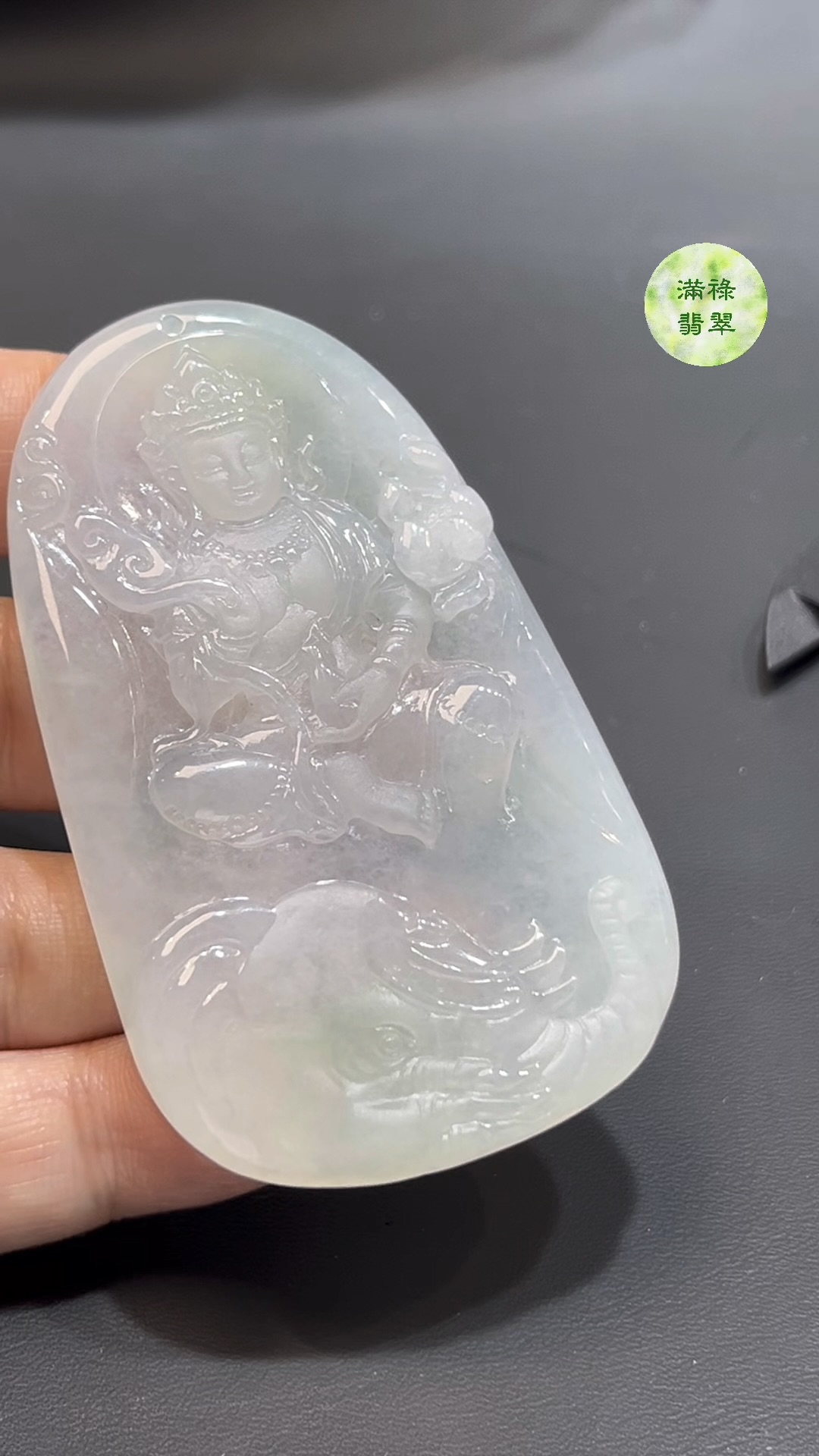 編號#768 翡翠普賢菩薩吊墜,選用天然翡翠玉料雕刻而成,玉質冰潤通透,色澤柔和純淨,種水佳,整體氣質靜謐高雅。普賢菩薩法相莊嚴慈悲,手持法器,身旁配象,象徵「大行圓滿、智慧護持、福德俱足」。雕工細緻,比例協調,面容柔和,衣紋流暢,每一筆都展現出匠人對佛像神韻嘅深刻理解。此吊墜不僅係靈性守護之物,更係一件極具文化底蘊與藝術價值嘅翡翠精品。