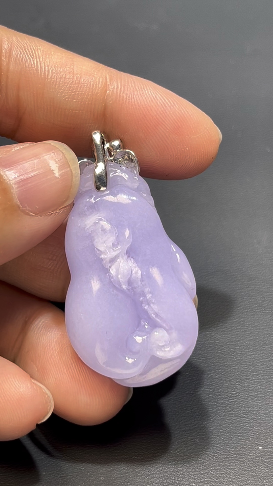 翡翠福瓜吊墜,編號#816,選用天然紫色翡翠玉料,色澤柔和高雅,質地細膩潤澤,通透度佳,展現出翡翠溫潤如玉的高級質感。紫色翡翠在翡翠色系中屬於稀有色調,象徵尊貴、靈性與祥瑞,搭配福瓜造型更添福氣寓意。