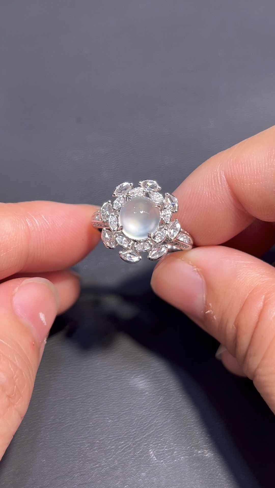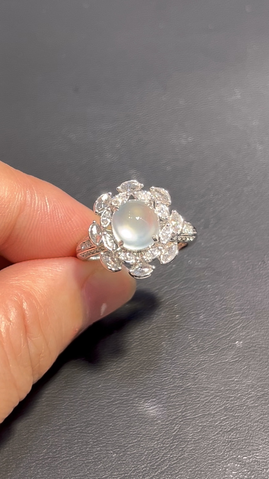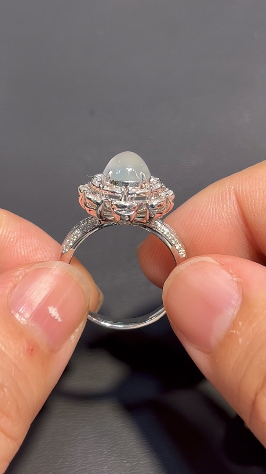 翡翠蛋面戒指 編號#678|冰潤質地 鑽石花形鑲嵌|冬日花朵 高級珠寶推薦