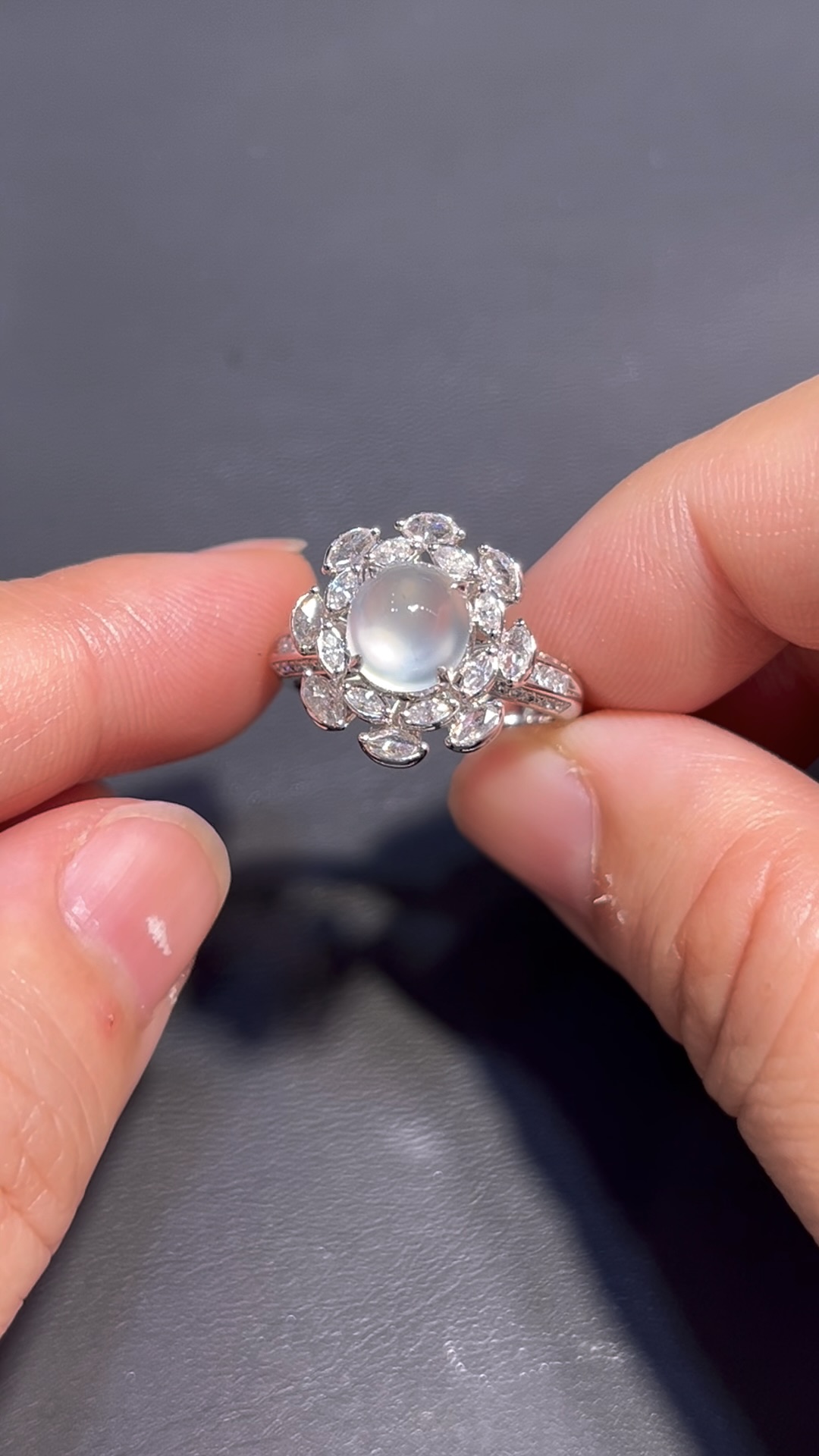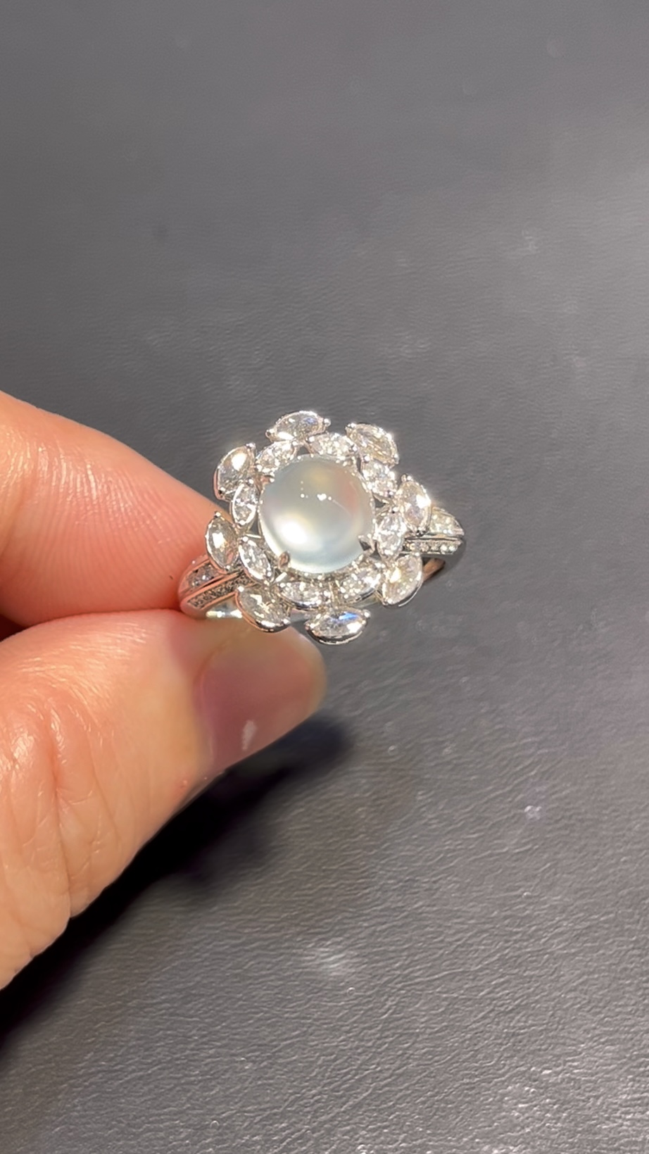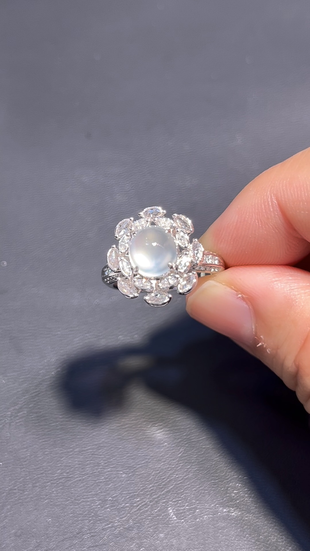 翡翠蛋面戒指 編號#678|冰潤質地 鑽石花形鑲嵌|冬日花朵 高級珠寶推薦