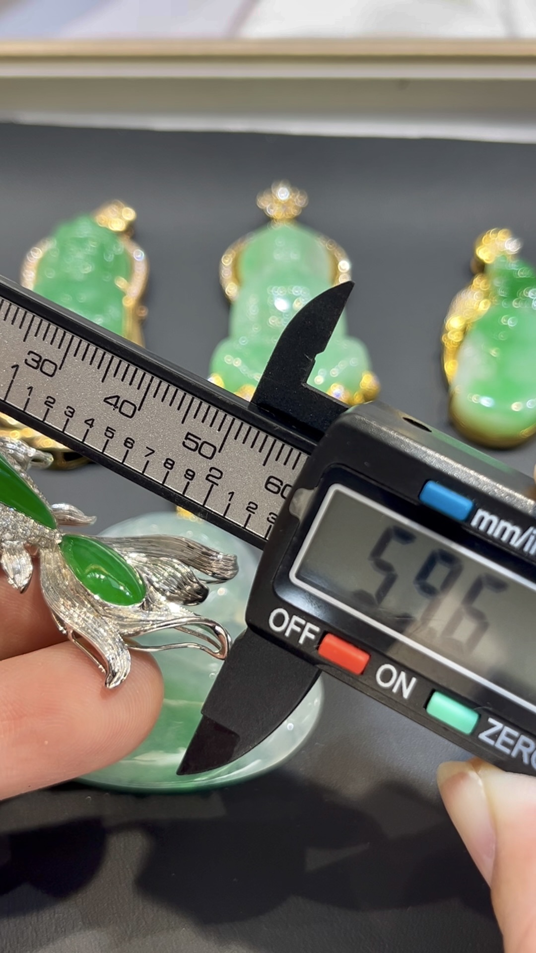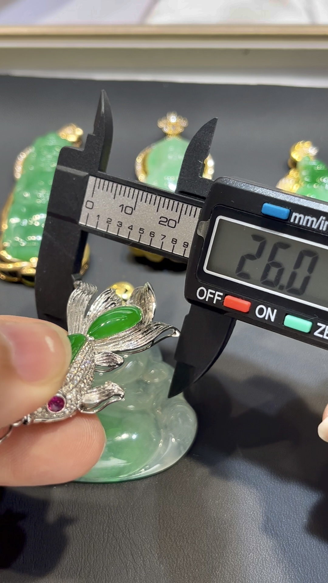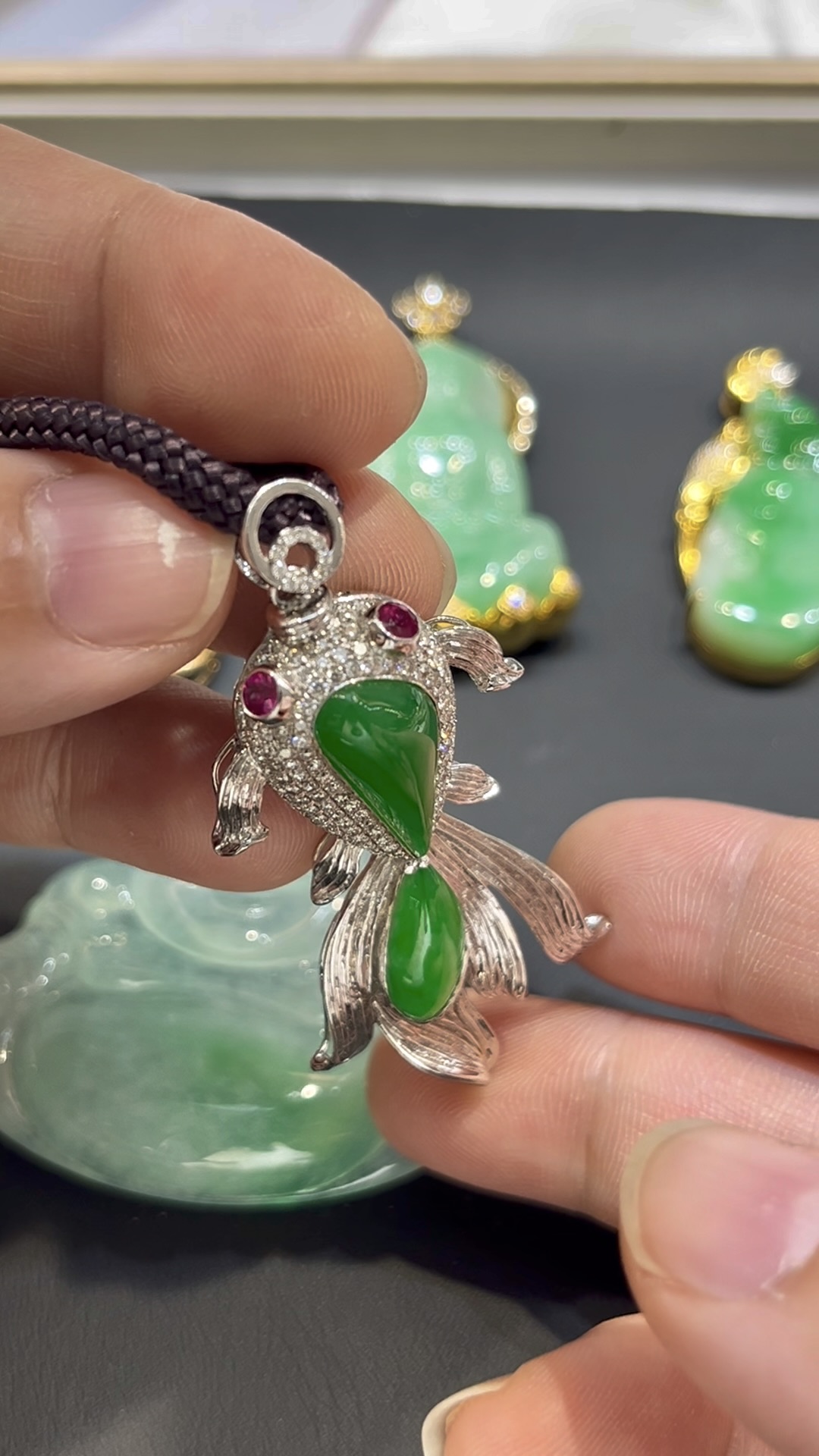 翡翠金魚吊墜,編號#775,選用天然隨影翡翠為主石,石料通透靈動,色澤柔和雅緻,質地細膩潤澤,水頭佳。吊墜以金魚為主題,整體造型靈動優雅,寓意「年年有餘、富貴綿延、福氣常在」。金魚身形以18K白金重金鑲嵌,並大量鑽石鋪排成魚身與魚尾,閃耀光芒如水中游動,工藝極致,視覺震撼。此款作品不僅展現高端珠寶工藝,更融合翡翠與鑽石的雙重美感,是一款兼具藝術性、寓意與收藏價值的翡翠精品。